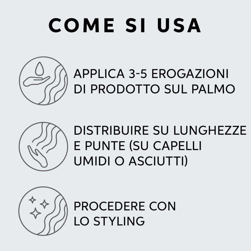 Applica 3-5 erogazioni di prodotto sul palmo. Distribuire su lunghezze e punte (su capelli umidi o asciutti). Procedere con lo styling