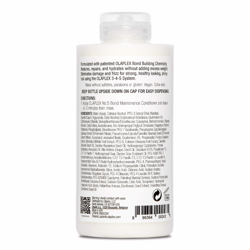 BOND MAINTENANCE™CONDITIONER OLAPLEX N°5 è formulato per l'uso quotidiano su tutti i tipi di capello per ripristinare, riparare e idratare senza aggiungere peso in eccesso. N°5 contiene il nostro singolo ingrediente attivo, Bis-Aminopropyl Diglycol Dimaleate, per la riparazione continua del legame, a casa o in salone. Il balsamo N°5 elimina danni, crespo ed effetto statico per ottenere capelli forti, sani e lucenti.