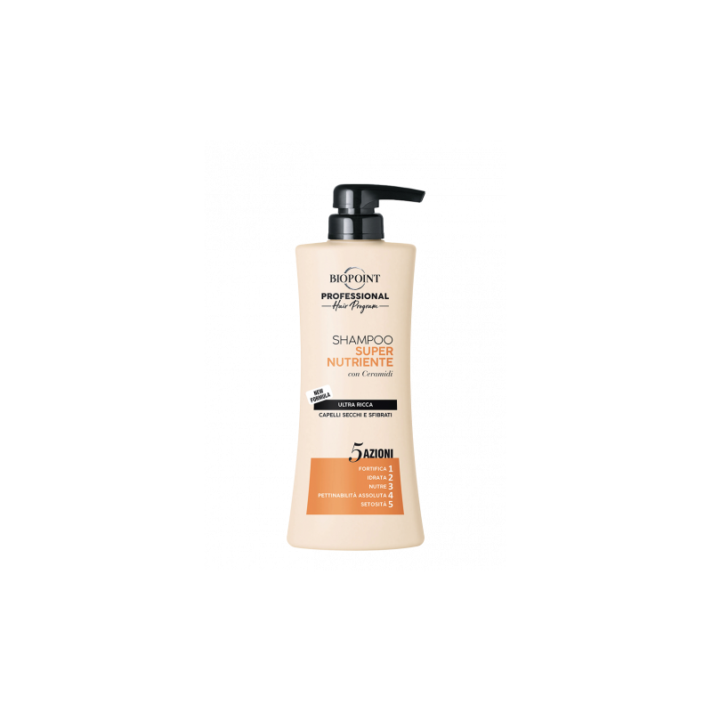 Lo Shampoo Super Nutriente con 5 Azioni dona nuova vitalità e benessere ai capelli secchi e sfibrati, per un risultato professionale direttamente a casa tua. Con Ceramidi, Olio di Camelia e Protein Complex, dalle proprietà nutrienti e sublimanti: 1 FORTIFICA e ristruttura, per capelli che si spezzano meno facilmente. 2 IDRATA la fibra capillare, migliorandone la consistenza e apportando lucentezza ai capelli spenti. 3 NUTRE e rivitalizza anche i capelli più secchi e sfibrati. 4 PETTINABILITÀ ASSOLUTA, i capelli sono più facili da districare grazie all’alto potere condizionante della formula. 5 SETOSITÀ sensazionale per capelli soffici, elastici e splendenti.