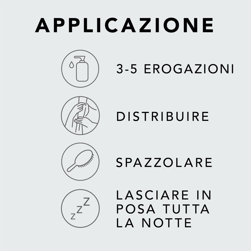 Applicazione: applicare e lasciare in posa tutta la notte. Applicare da 3 5 erogazioni sul palmo della mano e distribuire su capelli asciutti o umidi.