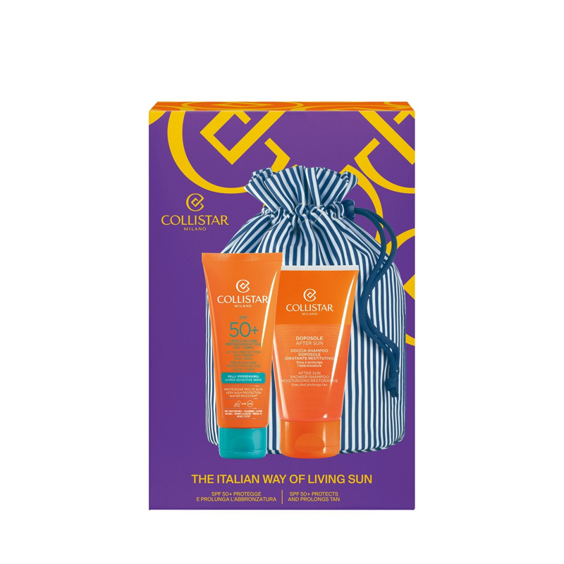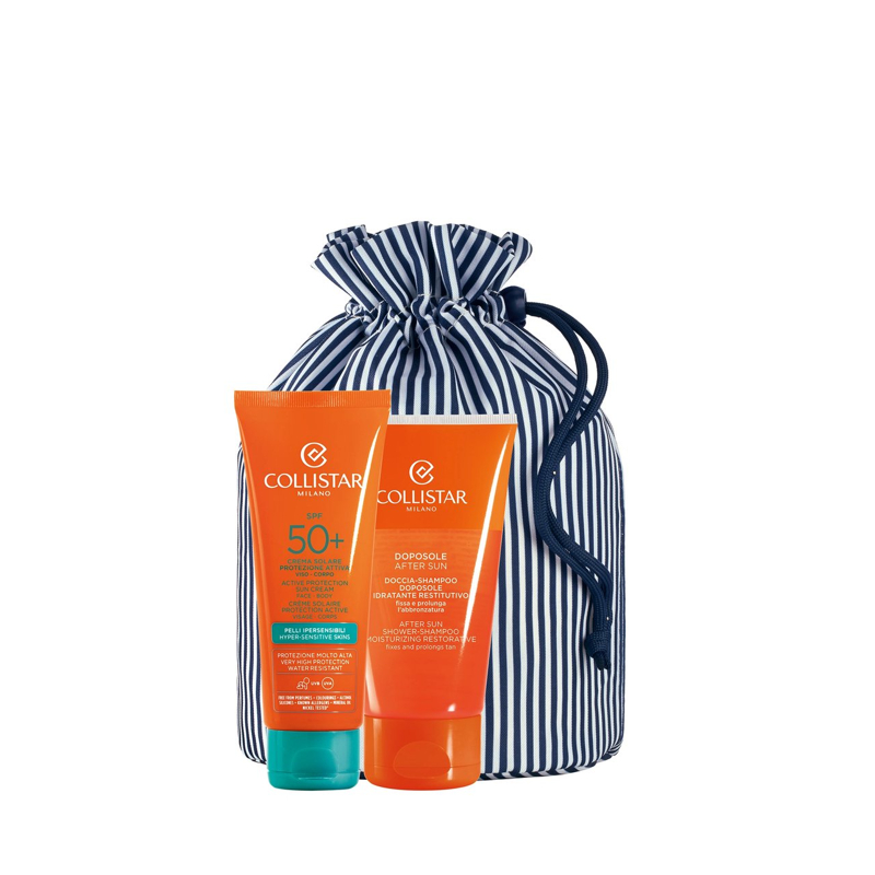 CREMA SOLARE PROTEZIONE ATTIVA PELLI IPERSENSIBILI SPF 50+ Il piacere e la sicurezza di una crema dalla texture morbida, ad altissima protezione, facile da applicare e di rapido assorbimento. Una formula ancora più potente che sfrutta le eccezionali proprietà dell’estratto di Opuntia iperfermentato, di origine italiana, ricco di flavonoidi, mucillagini e polisaccaridi e vitamine dall’elevato potere idratante, antiossidante e lenitivo. Questa azione è potenziata da uno speciale estratto di Luppolo, ricco di polifenoli, antiossidanti e antibatterici, in grado di calmare le irritazioni, migliorare l’idratazione e donare un generale senso di benessere per le pelli più sensibili sottoposte agli stress dell’esposizione solare. Adatta a tutta la famiglia anche ai bambini sotto i 3 anni e per proteggere capillari, macchie, nei, tatuaggi e cicatrici. Perfetta sia al mare che in montagna. Collistar è attenta al benessere del pianeta: il tubo è 100% in PCR riciclabile e le formule sono coral-friendly. TESTATO DERMATOLOGICAMENTE *nickel <0,001% DOCCIA-SHAMPOO DOPOSOLE IDRATANTE RESTITUTIVO Delicatissimo e neutro , questo prodotto garantisce un’impeccabile, dolcissima detersione dell'epidermide e dei capelli dopo le esposizioni al sole. Infatti, grazie a tensioattivi ultraselezionati di origine vegetale e sostanze emollienti (le proteine del collagene vegetale), elimina ogni residuo di salsedine, prodotti solari e impurità, regalando morbidezza sia ai tessuti cutanei che alla capigliatura. La sua formula innovativa ricca di ingredienti naturali evita inoltre la desquamazione cutanea e favorisce il prolungamento dell’abbronzatura.