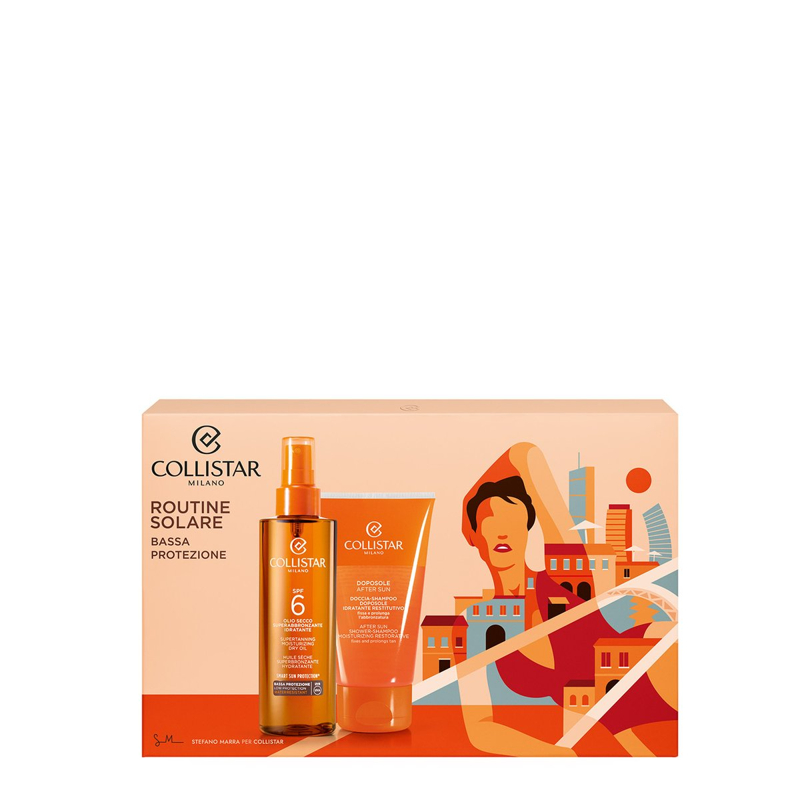 MILANO PORTRAIT Un’esclusiva collezione di cofanetti in edizione limitata celebra le origini milanesi di Collistar. Con il suo tratto unico e inconfondibile Stefano Marra ritrae gli scorci più affascinanti della città, incorniciandoli in eleganti figure femminili: una dedica alla bellezza autentica e senza tempo di Milano. OLIO SECCO SUPERABBRONZANTE IDRATANTE SPF 6 Ideale per chi desidera un’abbronzatura intensa e la sicurezza di una protezione ottimale. Resistente all’acqua, lascia la pelle morbida e levigata anche dopo lunghe esposizioni al sole. Grazie alla sua consistenza “secca” viene rapidamente assorbito, non unge e può essere usato anche sul viso. DOCCIA-SHAMPOO DOPOSOLE IDRATANTE RESTITUTIVO fissa e prolunga l’abbronzatura Delicatissimo e neutro, questo prodotto assicura un’azione detergente dolce e delicata, fissa l’abbronzatura e la rende più luminosa e duratura. Esercita un benefico effetto idratante, emolliente e restitutivo lasciando la pelle morbida e levigata. Restituisce vitalità e morbidezza ai capelli inariditi dagli agenti esterni. POCHETTE IN TESSUTO 100% RICICLATO Una pochette estiva pratica e funzionale realizzata in materiale 100% riciclato, ideale per portare sempre con te i tuoi prodotti solari Collistar preferiti.