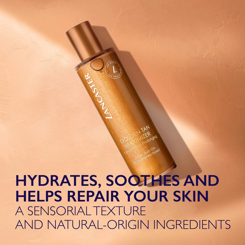 Ami l'abbronzatura dorata Lancaster? E se potessi prolungarla regalandoti una sensazione di estate infinita sulla pelle? Il nostro Golden Tan Maximizer After Sun Oil prolunga la tua abbronzatura fino a un mese e lenisce istantaneamente la pelle dopo l'esposizione solare. Il Tan Activator Complex Lancaster intensifica la produzione di melanina per un’abbronzatura dorata, uniforme e duratura. Questo olio sublimatore doposole contiene un complesso lenitivo e idratante per favorire il naturale processo di riparazione della pelle dopo l'esposizione solare. Riduce il rischio di spellatura e lascia la pelle morbida e satinata. Arricchito con sei oli di origine naturale, questo lussuoso olio sublimatore si fonde istantaneamente con la pelle, lasciandola idratata e levigata. La texture luminosa rivela un’abbronzatura radiosa e dorata e profuma la pelle con l'iconica profumazione Lancaster, adatta alla pelle sensibile.