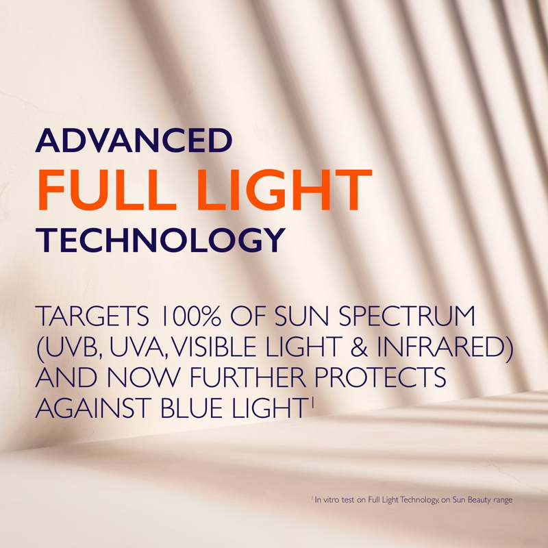 L’esposizione alla luce del sole è responsabile dell’80% dei segni visibili dell’invecchiamento**, un processo noto come fotoinvecchiamento. Ma i raggi UVA e UVB costituiscono solo il 10% dello spettro solare: per questo la nostra formula si spinge oltre la classica protezione, contrastando anche la luce visibile e i raggi infrarossi. La Full Light TechnologyTM offre una protezione contro lo spettro solare 10 volte più ampia***, per un risultato più efficace. La formula contiene inoltre il Tan Activator Complex in grado di stimolare il processo di abbronzatura, per una pelle dorata nella metà del tempo di esposizione al sole. Grazie al Sun Repair System, aiuta anche a riparare i danni causati dal sole.