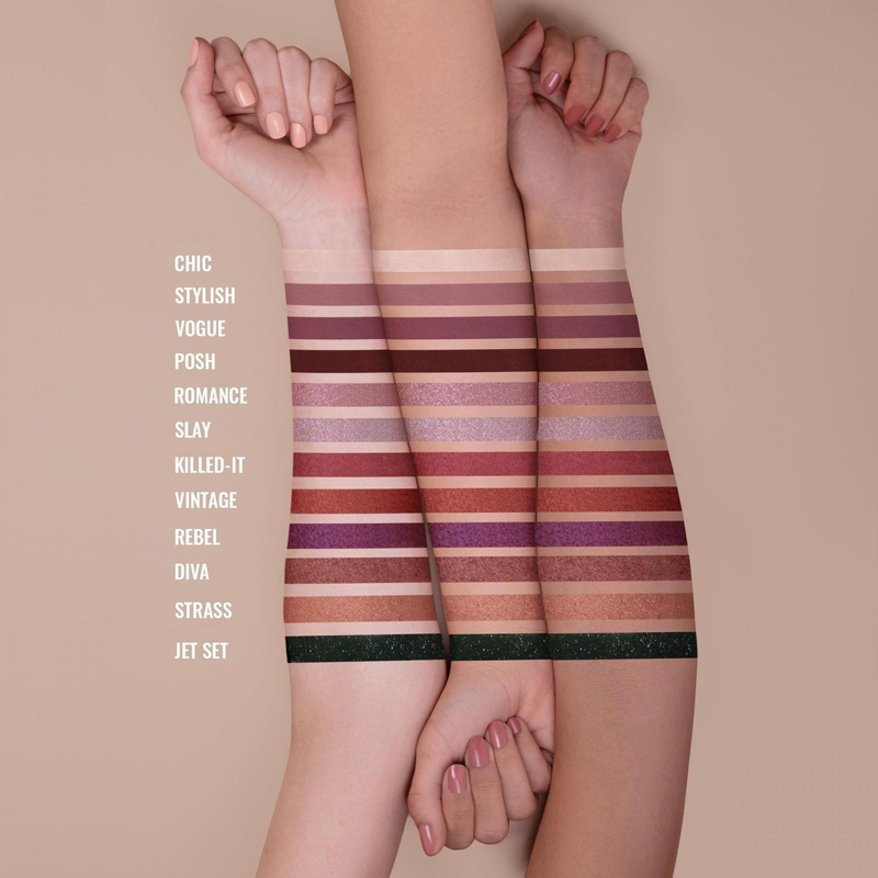 INGREDIENTS: CHIC (1) STYLISH (2) VOGUE (3) POSH (4) MICA, ZEA MAYS STARCH (ZEA MAYS (CORN) STARCH), SILICA, DIMETHICONE, CAPRYLYL GLYCOL, OCTYLDODECANOL, STEARYL STEARATE, CETYL PALMITATE, STEARYL PALMITATE, CETYL STEARATE, CERA ALBA (BEESWAX), METHICONE, CERA MICROCRISTALLINA (MICROCRYSTALLINE WAX), BEHENIC ACID, STEARIC ACID. +/- (MAY CONTAIN): CI 77891/TITANIUM DIOXIDE, CI 16035/RED 40 LAKE, CI 77491/IRON OXIDES, CI 77492/IRON OXIDES, CI 42090/BLUE 1 LAKE, CI 77499/IRON OXIDES. ROMANCE (5) MICA, ZINC STEARATE, DIMETHICONE, OCTYLDODECYL STEAROYL STEARATE, CAPRYLYL GLYCOL, CETEARYL ETHYLHEXANOATE, ACACIA DECURRENS/JOJOBA/SUNFLOWER SEED CERA/POLYGLYCERYL-3 ESTERS (ACACIA DECURRENS/JOJOBA/SUNFLOWER SEED WAX POLYGLYCERYL-3 ESTERS), OCTYLDODECANOL, TIN OXIDE. +/- (MAY CONTAIN): CI 77891/TITANIUM DIOXIDE, CI 77491/IRON OXIDES, CI 75470/CARMINE. SLAY (6) MICA, SYNTHETIC FLUORPHLOGOPITE, CALCIUM SODIUM BOROSILICATE, ZINC STEARATE, DIMETHICONE, OCTYLDODECYL STEAROYL STEARATE, CAPRYLYL GLYCOL, CETEARYL ETHYLHEXANOATE, ACACIA DECURRENS/JOJOBA/SUNFLOWER SEED CERA / POLYGLYCERYL-3 ESTERS (ACACIA DECURRENS/JOJOBA/SUNFLOWER SEED WAX POLYGLYCERYL-3 ESTERS), SILICA, OCTYLDODECANOL, TIN OXIDE. +/- (MAY CONTAIN): CI 77891/TITANIUM DIOXIDE. KILLED-IT (7) MICA, SYNTHETIC FLUORPHLOGOPITE, ZINC STEARATE, DIMETHICONE, OCTYLDODECYL STEAROYL STEARATE, CAPRYLYL GLYCOL, SILICA, CETEARYL ETHYLHEXANOATE, ACACIA DECURRENS/JOJOBA/SUNFLOWER SEED CERA/POLYGLYCERYL-3 ESTERS (ACACIA DECURRENS/JOJOBA/SUNFLOWER SEED WAX POLYGLYCERYL-3 ESTERS), OCTYLDODECANOL, TIN OXIDE. +/- (MAY CONTAIN): CI 77891/TITANIUM DIOXIDE, CI 77491/IRON OXIDES, CI 75470/CARMINE. VINTAGE (8) MICA, SYNTHETIC FLUORPHLOGOPITE, CALCIUM SODIUM BOROSILICATE, ZINC STEARATE, DIMETHICONE, OCTYLDODECYL STEAROYL STEARATE, CAPRYLYL GLYCOL, CETEARYL ETHYLHEXANOATE, ACACIA DECURRENS/JOJOBA/SUNFLOWER SEED CERA / POLYGLYCERYL-3 ESTERS (ACACIA DECURRENS/JOJOBA/SUNFLOWER SEED WAX POLYGLYCERYL-3 ESTERS), OCTYLDODECANOL. +/- (MAY CONTAIN): CI 77491/IRON OXIDES. REBEL (9) MICA, SYNTHETIC FLUORPHLOGOPITE, OCTYLDODECYL STEAROYL STEARATE, ZINC STEARATE, CAPRYLIC/CAPRIC TRIGLYCERIDE, CETEARYL ETHYLHEXANOATE, JOJOBA ESTERS, DECYLENE GLYCOL, AQUA/WATER, HELIANTHUS ANNUUS SEED CERA (HELIANTHUS ANNUUS (SUNFLOWER) SEED WAX), TIN OXIDE, GLYCERIN, OCIMUM BASILICUM FLOWER/LEAF EXTRACT (OCIMUM BASILICUM (BASIL) FLOWER/LEAF EXTRACT), LONICERA JAPONICA FLOWER EXTRACT (LONICERA JAPONICA (HONEYSUCKLE) FLOWER EXTRACT), CITRUS PARADISI FRUIT EXTRACT (CITRUS GRANDIS (GRAPEFRUIT) PEEL OIL), USNEA BARBATA EXTRACT (USNEA BARBATA (LICHEN) EXTRACT), ACACIA DECURRENS FLOWER CERA (ACACIA DECURRENS FLOWER WAX), POLYGLYCERIN-3. +/- (MAY CONTAIN): CI 77891/TITANIUM DIOXIDE, CI 77491/IRON OXIDES, CI 77510/FERRIC FERROCYANIDE, CI 75470/CARMINE. DIVA (10) MICA, SYNTHETIC FLUORPHLOGOPITE, ZINC STEARATE, DIMETHICONE, OCTYLDODECYL STEAROYL STEARATE, CAPRYLYL GLYCOL, CETEARYL ETHYLHEXANOATE, ACACIA DECURRENS/JOJOBA/SUNFLOWER SEED CERA/POLYGLYCERYL-3 ESTERS (ACACIA DECURRENS/JOJOBA/SUNFLOWER SEED WAX POLYGLYCERYL-3 ESTERS), OCTYLDODECANOL, TIN OXIDE. +/- (MAY CONTAIN): CI 77891/TITANIUM DIOXIDE, CI 77491/IRON OXIDES, CI 77499/IRON OXIDES. STRASS (11) MICA, SYNTHETIC FLUORPHLOGOPITE, OCTYLDODECYL STEAROYL STEARATE, ZINC STEARATE, CAPRYLIC/CAPRIC TRIGLYCERIDE, CETEARYL ETHYLHEXANOATE, JOJOBA ESTERS, DECYLENE GLYCOL, AQUA/WATER, HELIANTHUS ANNUUS SEED CERA (HELIANTHUS ANNUUS (SUNFLOWER) SEED WAX), TIN OXIDE, GLYCERIN, OCIMUM BASILICUM FLOWER/LEAF EXTRACT (OCIMUM BASILICUM (BASIL) FLOWER/LEAF EXTRACT), LONICERA JAPONICA FLOWER EXTRACT (LONICERA JAPONICA (HONEYSUCKLE) FLOWER EXTRACT), CITRUS PARADISI FRUIT EXTRACT (CITRUS GRANDIS (GRAPEFRUIT) PEEL OIL), USNEA BARBATA EXTRACT (USNEA BARBATA (LICHEN) EXTRACT), ACACIA DECURRENS FLOWER CERA (ACACIA DECURRENS FLOWER WAX), POLYGLYCERIN-3. +/- (MAY CONTAIN): CI 77891/TITANIUM DIOXIDE, CI 77491/IRON OXIDES, CI 77510/FERRIC FERROCYANIDE, CI 75470/CARMINE. JET-SET (12) MICA, SYNTHETIC FLUORPHLOGOPITE, ZEA MAYS STARCH (ZEA MAYS (CORN) STARCH), SILICA, DIMETHICONE, CAPRYLYL GLYCOL, OCTYLDODECANOL, STEARYL STEARATE, CETYL PALMITATE, STEARYL PALMITATE, CETYL STEARATE, CERA ALBA (BEESWAX), METHICONE, CERA MICROCRISTALLINA (MICROCRYSTALLINE WAX), BEHENIC ACID, STEARIC ACID. +/- (MAY CONTAIN): CI 77499/IRON OXIDES, CI 77891/TITANIUM DIOXIDE.