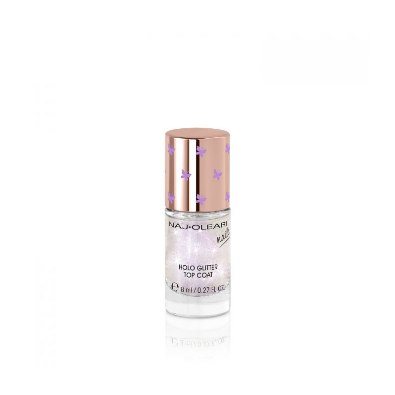 Smalto top coat glitter che regala alle unghie una brillantezza perlata effetto gloss. La texture trasparente è arricchita da micro glitter multiriflesso sui toni lilla per creare un look effetto olografico. Perfetto per essere applicato da solo per un look naturale ed elegante o come top coat per impreziosire lo smalto. Holo Glitter Top Coat rifletterà di bagliori aiutando a proteggere lo smalto e aggiungendo un tocco rilucente alle unghie.