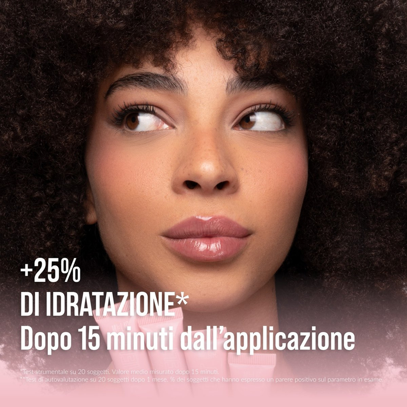 Idratazione +25% in soli 15 minuti* Labbra più piene e rimpolpate 100%** Labbra più lisce e morbide 100%** Contorno labbra più definito 100%** Confortevolezza in applicazione 100%** Acquisterebbe il prodotto 100%** La formula, dalla texture avvolgente e confortevole, ripara e rigenera le labbra durante e dopo l’applicazione, offrendo un comfort immediato. Il finish specchiato le rende lucide e il leggero rilascio di colore le tonalizza, per un effetto glassy e ricercato. Arricchita con burro di karité, dalle proprietà nutrienti e ristrutturanti, e con agenti emollienti protettivi, aiuta a contrastare la secchezza e a mantenere le labbra morbide e levigate. Formula vegan e cruelty free. *Test strumentale su 20 soggetti. Valore medio misurato dopo 15 minuti. **Test di autovalutazione su 20 soggetti. % dei soggetti che hanno espresso un parere positivo sul parametro in esame.