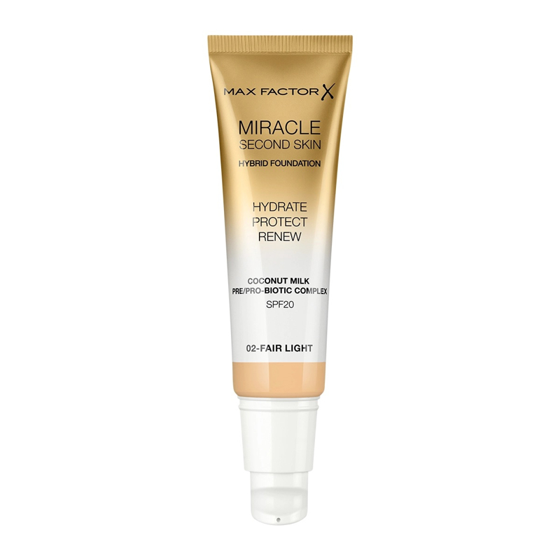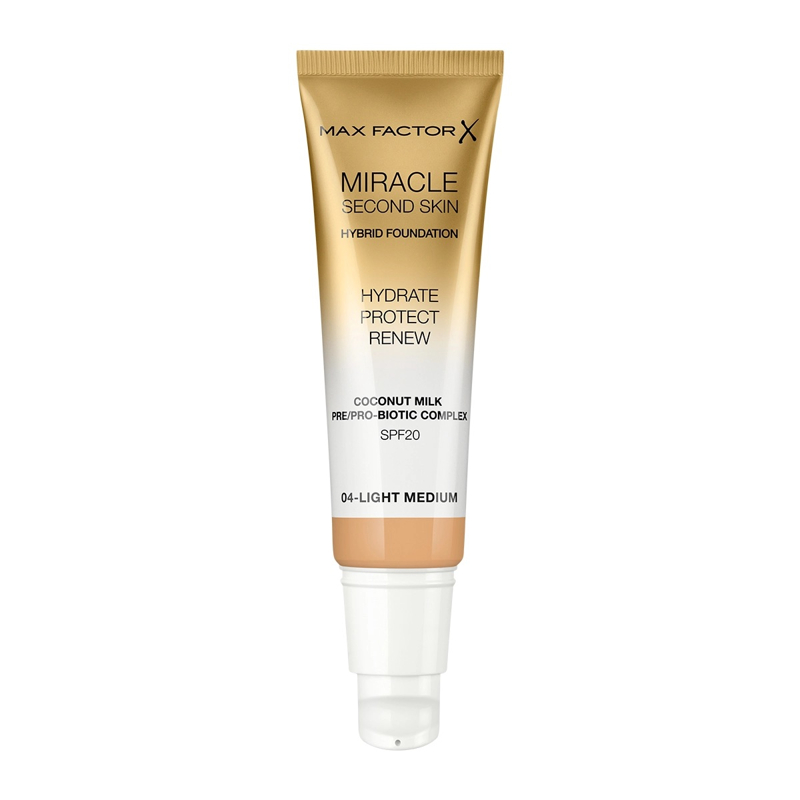 Max Factor Miracle Second Skin è una fondotinta ibrido unico. Grazie al latte di cocco di origine naturale garantisce idratazione alla pelle per tutto il giorno. La sua formula leggera, ricca e facilmente sfumabile offre una copertura impercettibile. Regala un finish naturale che si fonde con la pelle. È arricchito con pre e probiotici per aiutare le difese naturali della pelle. La formula Miracle Second Skin è clinicamente testata per aiutare il rinnovamento cellulare e contiene SPF20 per una protezione UVA e UVB. Questo fondotinta è adatto a tutti i tipi di pelle, compresa quella sensibile.