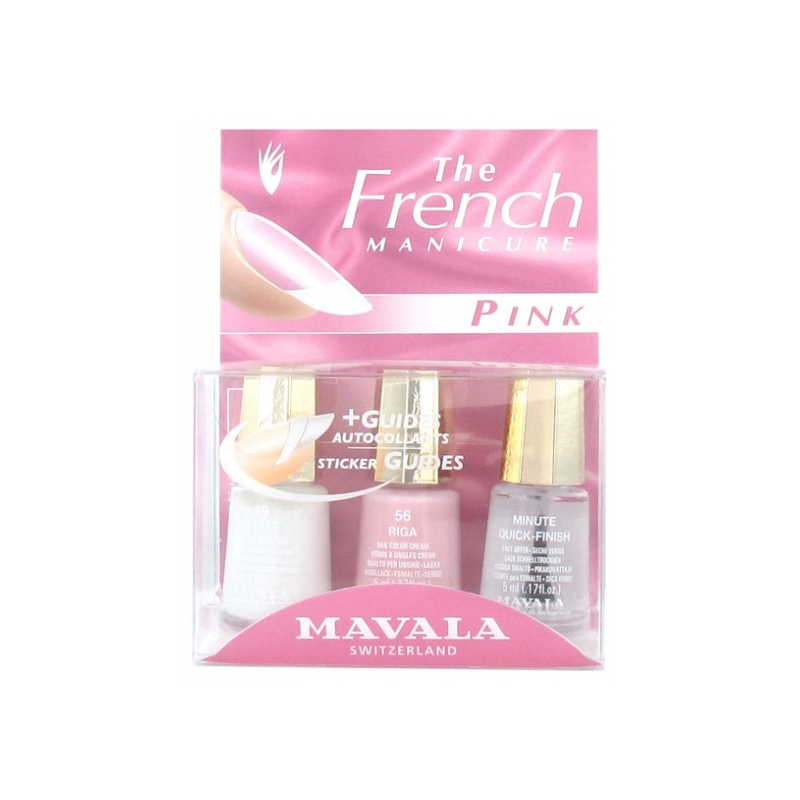 Le tecniche proposte da MAVALA si inseriscono perfettamente nel contesto del trucco naturale e si abbinano a tutti i tipi di abbigliamento. Molte donne preferiscono l'unghia naturale, con solo un accenno di colore, come alternativa a colori vivaci e vistosi. La manicure dura più a lungo e le imperfezioni sono meno visibili. La "French Manicure Pink" si ottiene con smalto "White 49" e smalto "Riga 56" per un effetto scintillante rosato. Il kit contiene anche l'asciuga smalto rapido "Minute Quick-Finish" che aggiunge lucentezza incomparabile.