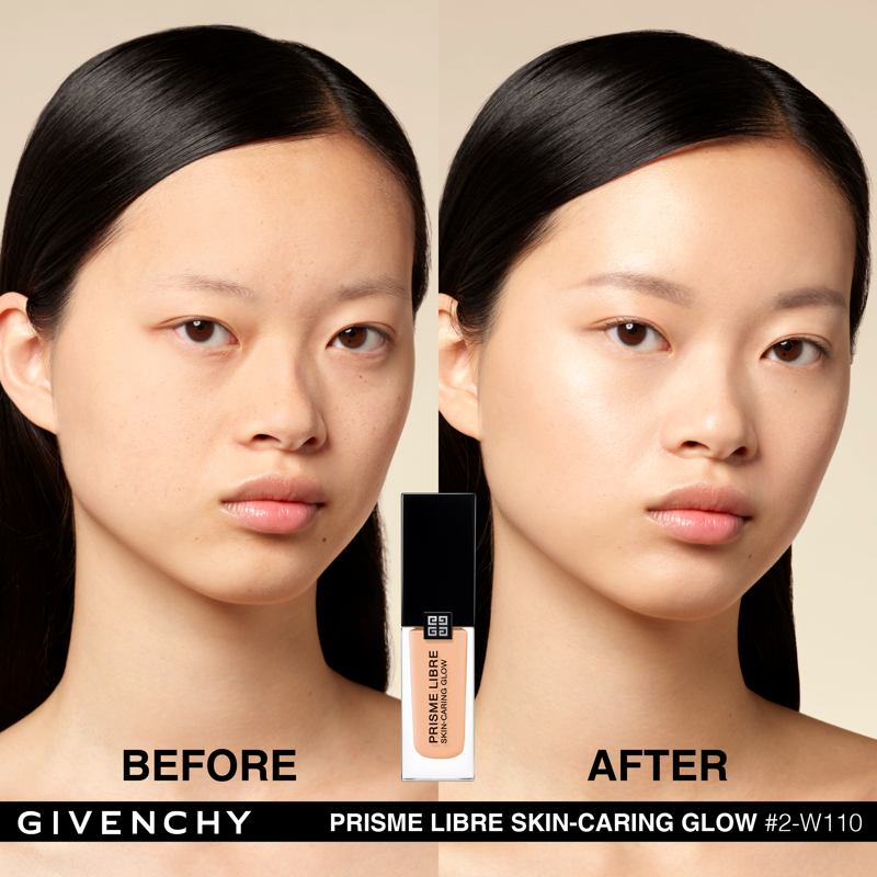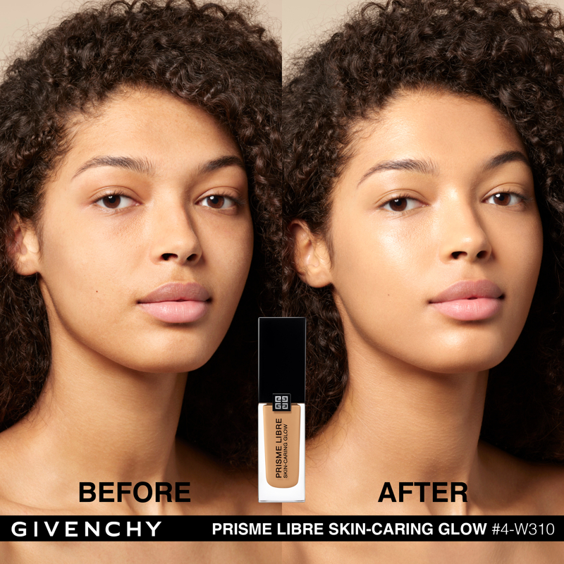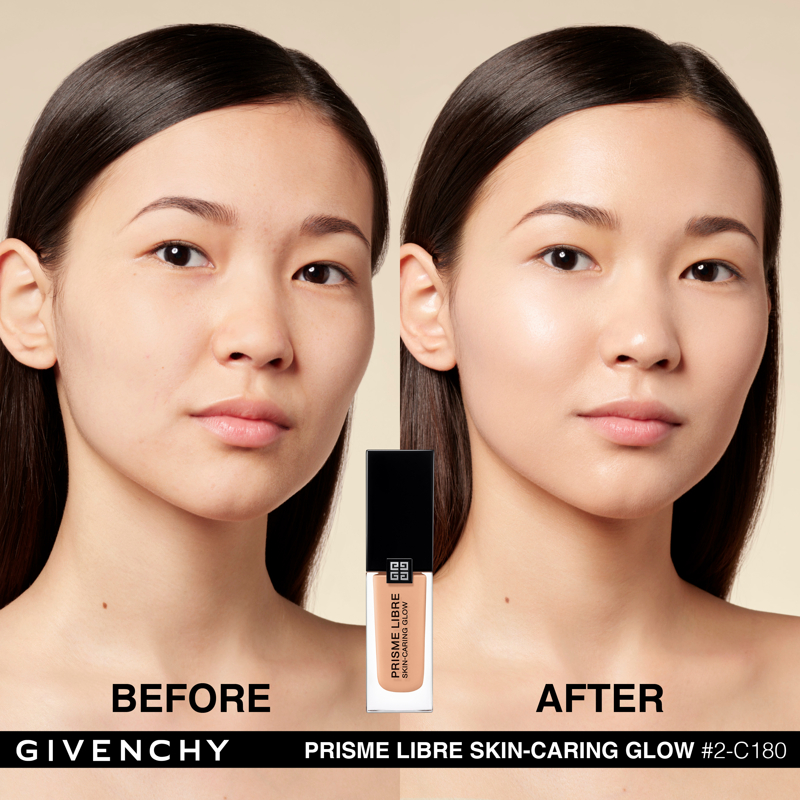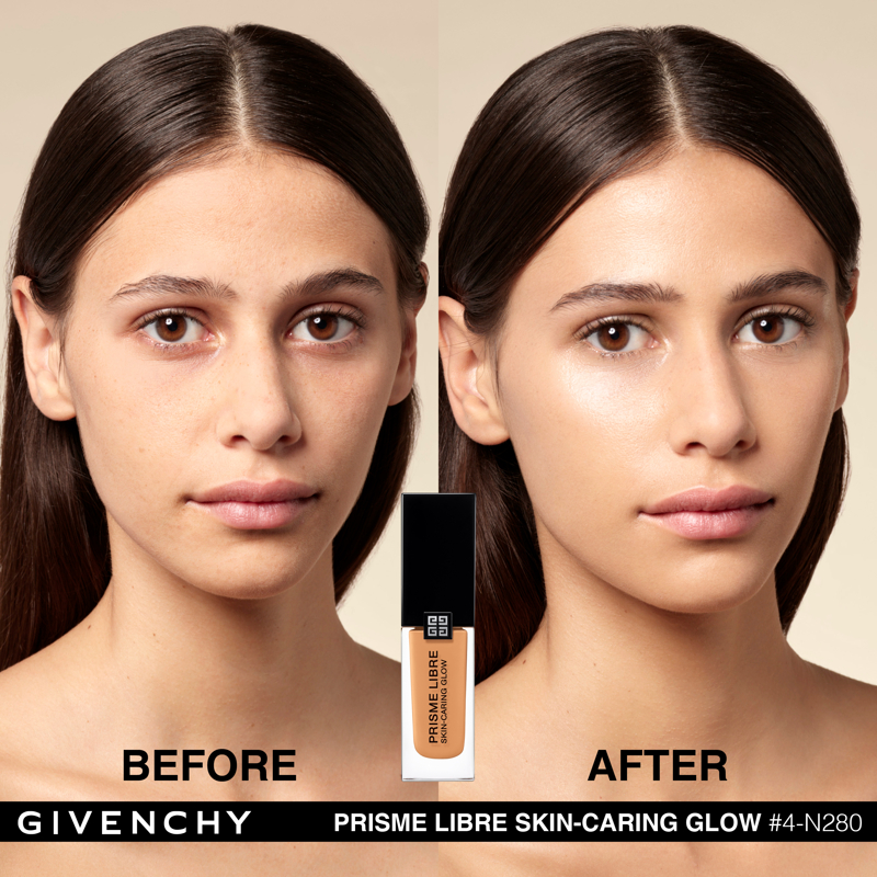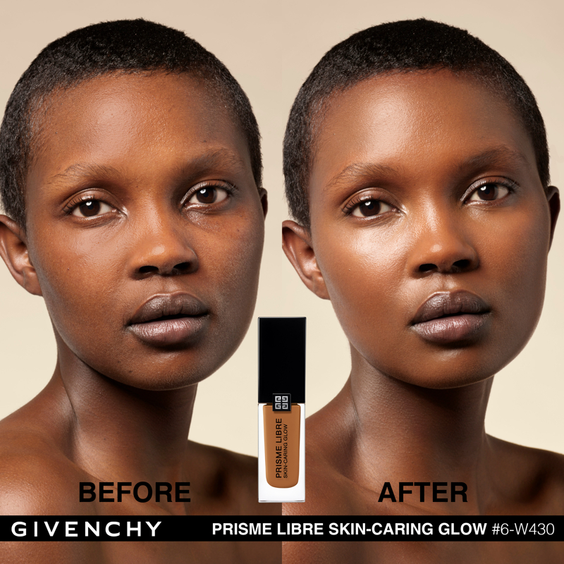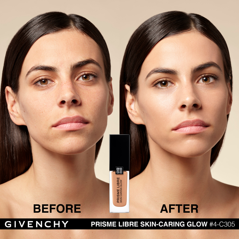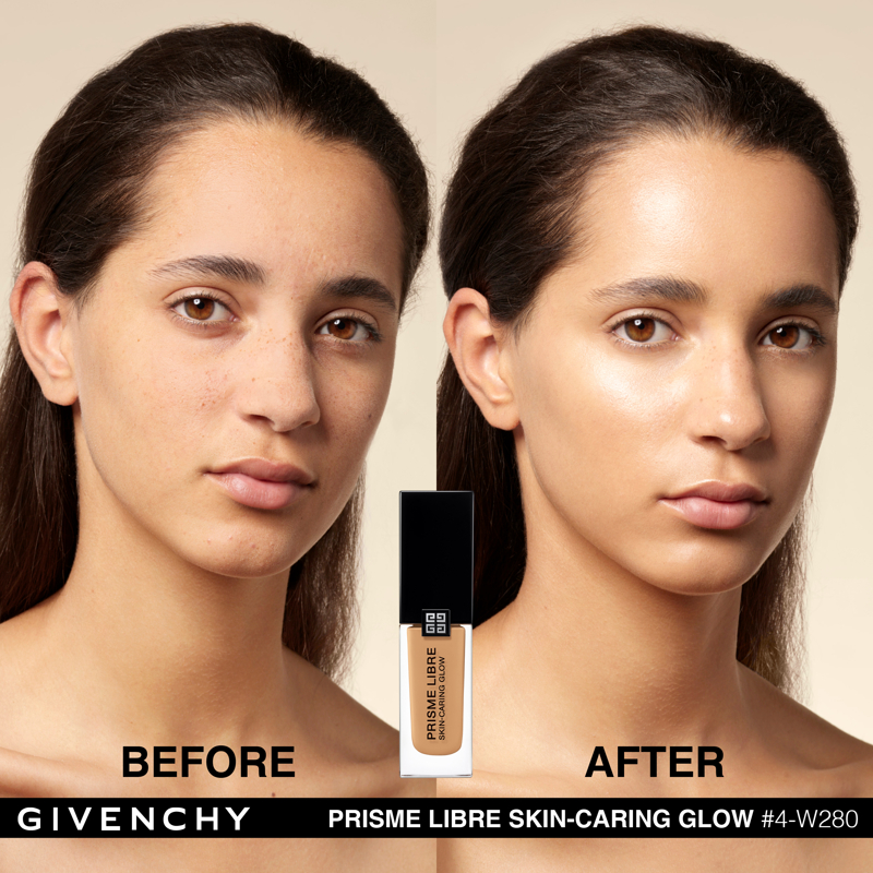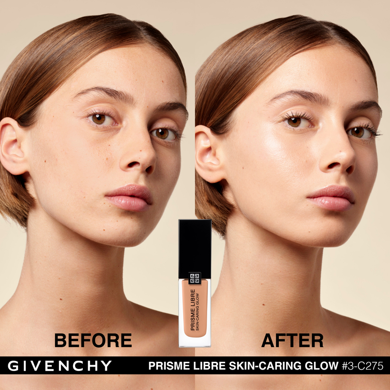 Domare la luce. È da questa ricerca assoluta che è nato Prisme Libre di Givenchy. “Prisme”, per la sua capacità di rifrangere la luce in tutte le dimensioni. “Libre”, per la leggerezza e la finezza naturale di una texture che lascia vivere e respirare la pelle. Con lo stesso spirito, Givenchy propone oggi Prisme Libre Skin-Caring Glow, un fondotinta ibrido che supera i limiti del make up, Givenchy Prisme Libre Skin-Caring Glow integra il dosaggio record del 90%* di una base trattante e ben il 97%** di ingredienti di origine naturale. Inoltre, avendo a cuore la tutela dell’ambiente, è biodegradabile all’89%***. Givenchy Prisme Libre Skin-Caring Glow, un fondotinta sublimatore che si prende cura della pelle in modo tale da renderla visibilmente più bella con il passare del tempo. 12 ORE DI LUMINOSITÀ(1) Givenchy Prisme Libre Skin-Caring Glow racchiude 4 pigmenti correttori di colori diversi, particelle madreperlate che riflettono la luce e oli che contribuiscono a diffondere il minimo raggio: appena applicato, offre un effetto glow che dura 12 ore(1). Arricchito con attivi trattanti, rivela di giorno in giorno la luminosità naturale del colorito, che risulta migliorata del 57%(1) dopo quattro settimane di applicazione. 12 ORE DI CORREZIONE (1) I pigmenti “4 colori” del fondotinta Givenchy Prisme Libre Skin-Caring Glow contribuiscono a correggere le discromie mentre degli agenti sfumanti aiutano ad attenuare le piccole imperfezioni, a satinare la texture della pelle e ad affinare i pori. I benefici del fondotinta sulla qualità della pelle sono ottimizzati man mano che viene applicato: nel giro di quattro settimane, la comparsa dei pori diminuisce del 19%(1) e le imperfezioni del colorito sono ridotte del 13%(1). Prisme Libre Skin-Caring Glow rende la pelle più bella in modo naturale, la lascia respirare e permette di migliorarne la qualità, giorno dopo giorno. La luminosità naturale del loro colorito è visibilmente sublimata. Questi benefici sono confermati dagli studi clinici(1): dopo quattro settimane di utilizzo, la qualità della pelle è migliorata, l’aspetto idratato e la sua luminosità naturale è elevata. 24 ORE DI IDRATAZIONE(1) Battezzato Advanced Glow ComplexTM, il cuore attivo della formula del fondotinta Givenchy Prisme Libre Skin-Caring Glow integra una base trattante arricchita con ingredienti illuminanti e idratanti come l’estratto di nasturzio e di glicerina. Ciò garantisce non solo 24 ore(1) di idratazione intensa sin dall’applicazione, ma anche un netto miglioramento dell’idratazione della pelle nel corso del tempo: +25%(1) in quattro settimane. L’aspetto polposo della pelle aumenta del 10%(1). IL LUSSO DI DOMANI Il flacone del fondotinta Givenchy Prisme Libre Skin-Caring Glow racconta lo spirito Couture della Maison. È stato ideato in maniera ecoresponsabile per limitare il suo impatto ambientale. Statutario, riprende i codici estetici della gamma Prisme Libre: una base quadrata, un grande tappo nero laccato, delle linee scultoree e l’indispensabile firma delle 4G. *Il restante 10%è costituito da pigmenti e microperle **Il restante 3% contribuisce a ottimizzare l’integrità della formula nel tempo e la sua sensorialità *** Dati misurati per 28 giorni secondo il test OCSE 301B (1) Test clinico-strumental sotto controllo dermatologico su 33 donne tra i 21 e i 54 anni