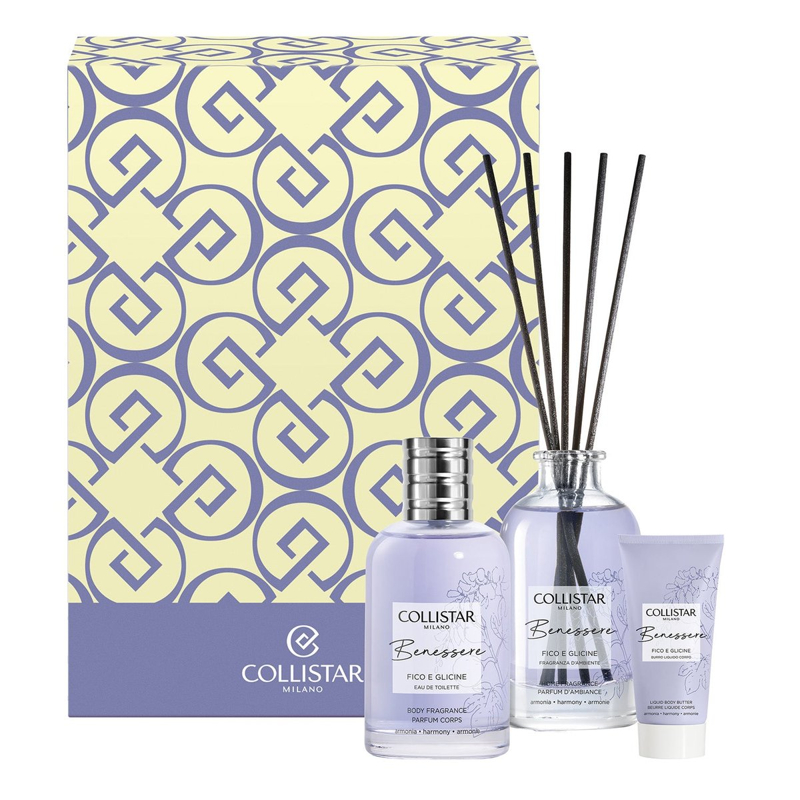 BENESSERE FICO E GLICINE un’infusione di armonia Questo esclusivo cofanetto della Linea Benessere Fico e Glicine trasforma la body routine in un’autentica pausa rigenerante. Una vera e propria esperienza multisensoriale che ricrea la perfetta atmosfera e regala un’immediata sensazione di armonia e equilibrio. BENESSERE FICO E GLICINE - EAU DE TOILETTE 100 ml Una fragranza per il corpo eterea e lussuosa, che celebra la cremosa vivacità del fico, magnificandone le sfumature verdi e mediterranee in un connubio di contrasti tra la bigarade e la sontuosa ricercatezza del glicine che, con i suoi tocchi leggermente speziati, esalta un sottofondo sussurrato di legni preziosi. Grazie agli estratti addolcenti e idratanti di Fico Bianco italiano e Pepe Rosa, offre molteplici benefici sia alla pelle che alla mente. BENESSERE FICO E GLICINE - BURRO LIQUIDO CORPO Leggero e morbido, questo burro, grazie all’estratto di Fico Bianco italiano, al Pepe Rosa e all’olio di mandorle dolci, dona alla pelle una setosa levigatezza, assicurando idratazione e nutrimento. Il plus della formula? Al suo interno uno speciale attivo di neurocosmesi, l’estratto di Olio di Coriandolo, che genera una sensazione di armonia ed equilibrio. La sua texture vellutata, a contatto con la pelle, si scioglie in una piacevole carezza, mentre la sua fragranza, dalle dolci note cremose del fico, esaltate dalla sontuosa ricercatezza del glicine, avvolge il corpo e la mente lasciando sulla pelle un leggero profumo e rendendo l’applicazione un’esperienza di benessere totale. BENESSERE FICO E GLICINE - FRAGRANZA D’AMBIENTE Perfetta per creare la giusta atmosfera a casa o in ufficio, è una vera e propria infusione di armonia ed equilibrio che abbraccia i sensi, evocando il clima mite e dolce del mediterraneo dalle avvolgenti note di fico unite a tocchi leggermente speziati di glicine. Adatta ad ogni ambiente, sprigiona un piacevole profumo costante, con la giusta intensità! MODO D’USO Inserire i bastoncini nel flacone e aspettare che il profumo inizi a diffondersi. Per una perfetta esperienza olfattiva, capovolgere i bastoncini almeno una volta a settimana.