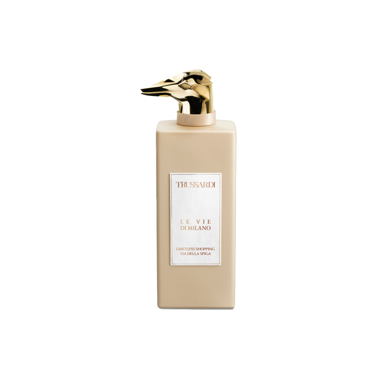 Fragranze iconiche e unisex per i nuovi profumi Trussardi: un viaggio che inizia da lontano per rivivere l'atmosfera unica delle Vie di Milano. Nasce con note di bergamotto, mela e favo d'api il profumo Limitless Shopping in Via della Spiga, per scivolare poi in eleganti note di rosa, gelsomino e mahonial. Il cuore racchiude una goccia di miele, per una fragranza sensuale e voluttuosa. Al fondo eliotropina, biancospino e fava tonka lasciano un gusto musk orientale inconfondibile e penetrante. Il flacone in vetro satinato è declinato nei toni powder beige con tappo scultura in metallo dorato che riproduce fedelmente la testa in miniatura del levriero italiano.