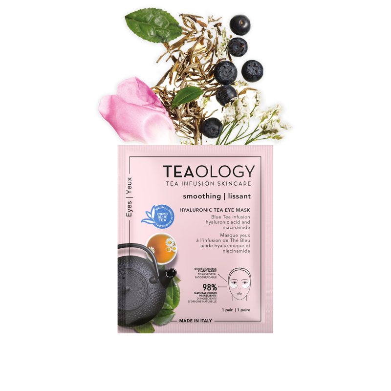 Un infuso di bellezza per il contorno occhi. La ricerca cosmetica di Teaology ha trasformato uno dei più classici consigli di bellezza che suggerisce di utilizzare due bustine di tè per eliminare gonfiori, borse, rossori e infiammazioni in un potente trattamento per il contorno occhi. Questi maxi-patch in tessuto sono arricchiti con il nostro infuso brevettato di Tè Blu Biologico, fonte naturale di antiossidanti e clinicamente testato con inquinamento e stress ossidativo, niacinamide e caffeina che aiutano a eliminare i segni della stanchezza, le occhiaie e le borse. Un aminoacido naturale protegge dall'impatto della luce blu, mentre l'acido ialuronico in tre diversi pesi molecolari idrata in profondità e una miscela di 6 diversi tipi di tè leviga le rughe e le linee sottili. I maxi-patch hanno un effetto invisibile quando vengono applicati e sono realizzati con fibre biodegradabili al 100%.