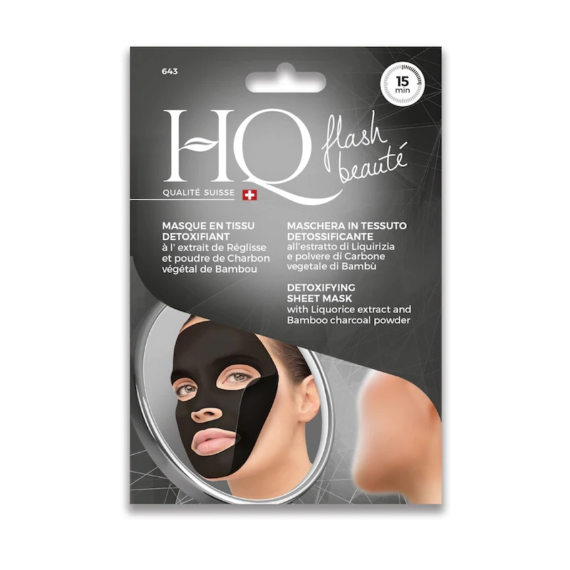 HQ maschera viso in tessuto detox detossificante all'estratto di Liquirizia e polvere di Carbone vegetale di Bambù. Permette di eliminare a fondo le impurità della pelle.